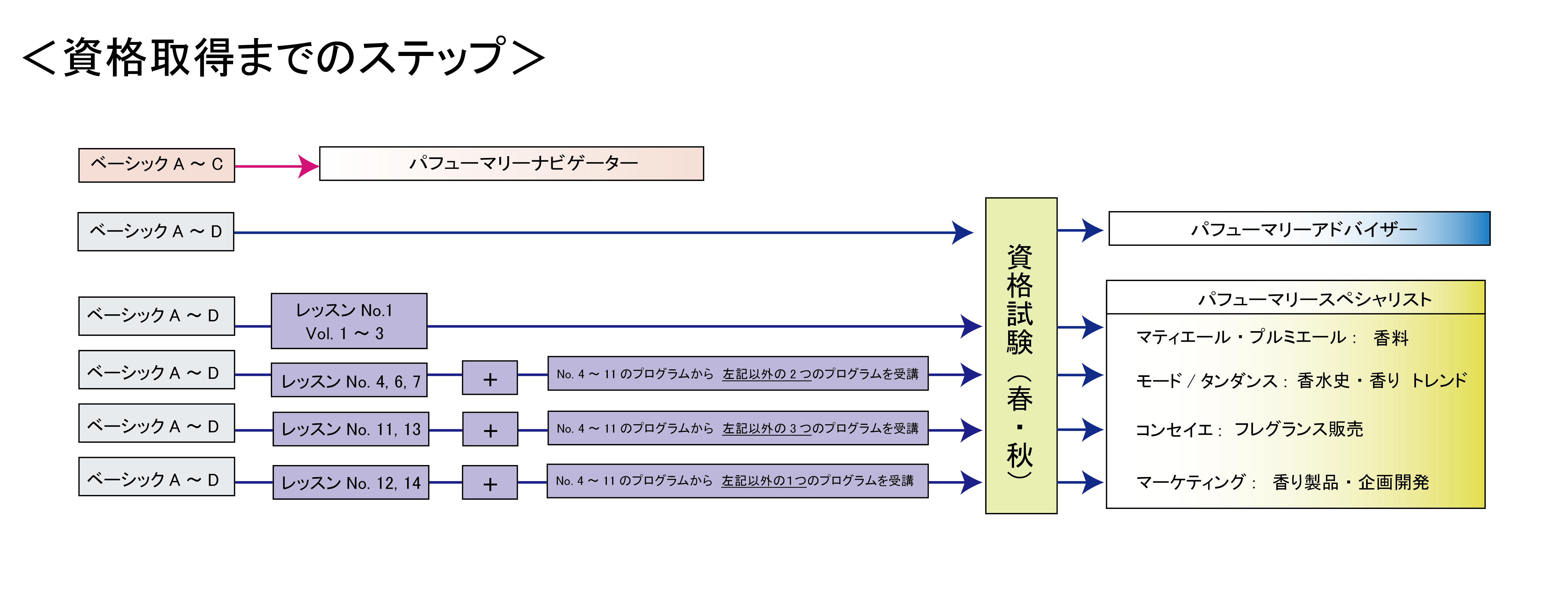試験に合格すると授与される「パフューマリーアドバイザー」と「パフューマリースペシャリスト」の3つがあります。